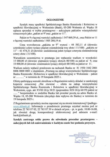 OGŁOSZENIE Syndyk masy upadłości Spółdzielczego Banku Rzemiosła i Rolnictwa w upadłości likwidacyjnej w Wołominie ...